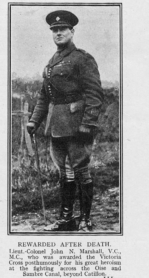 James Neville Marshall received his Victoria Cross posthumously when it was presented to his widow, Edith Marshall, on 12th April 1919 by King George V in Buckingham Palace. He is buried North-West of Ors, at the Ors Communal Cemetery. On his gravestone is written “Splendid is Death When thou fallest courageous Leading the onslaught,”